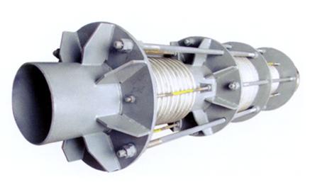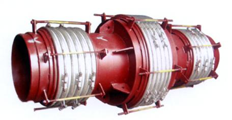 腰鼓式直管压力平衡波纹膨胀节的两端各有一个工作波纹管,中间有一个平衡波纹管,膨胀节通过受力构件(大拉杆或舌管)来承受内压推力。因此管系中间固定支架。此类膨胀节只能吸收轴向位移。